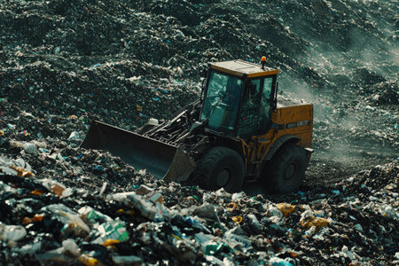 Heavy machinery works diligently to manage waste at a bustling landfill surrounded by endless refuse.