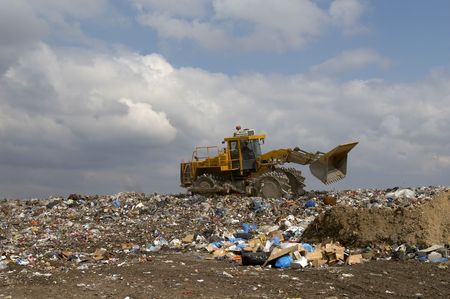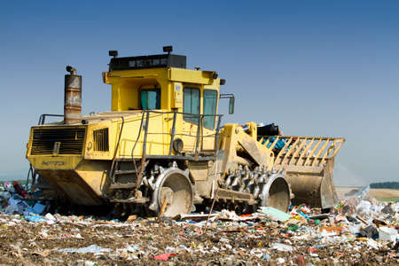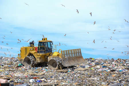 A Bulldozer machine moving waste and household garbage on a large landfill heap