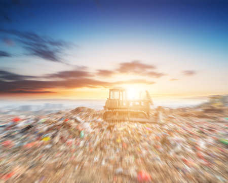 Recycling garbage dump with yellow bulldozer on the background of the sun