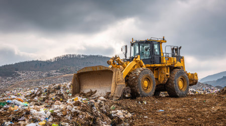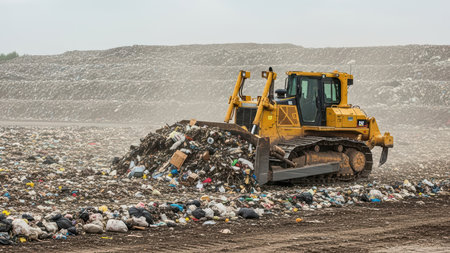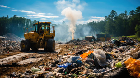 Landfill waste disposal. Garbage dump with waste plastic and polyethylene. Bulldozer at landfill working on rubbish disposal. Reduce greenhouse gas emissions and methane emissions.