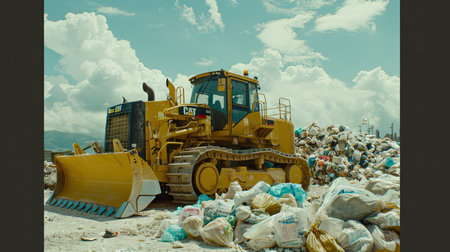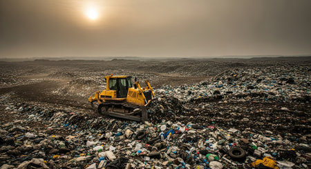 Heavy machinery moves across a massive landfill covered with plastic debris, representing environmental issues, pollution, and waste management.