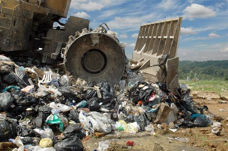Heavy machinery shredding garbage in an open air landfill. Waste