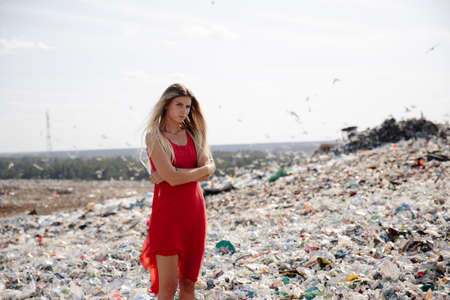 Nature pollution activist at a huge trash dump outdoors - Young blonde woman in a red dress - Looking at all the human waste and plastic in our world - Seagulls flying in Eastern Europe Latvia Riga