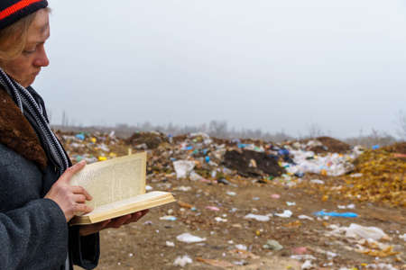 Homeless woman reads a book on the background of a junkyard. A dirty woman holds a book on a background of garbage. Free space for text
