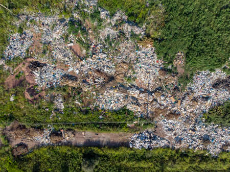 Environmental pollution. Aerial top view photo from flying drone of large garbage pile. Garbage pile in trash dump or landfill.