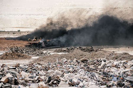 Fire at garbage dump. Black smoke from burning old tyres and bulldozer fighting fire