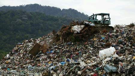 Landfill waste disposal. Garbage dump with waste plastic and polyethylene. Bulldozer at landfill working on rubbish disposal. Reduce greenhouse gas emissions and methane emissions.