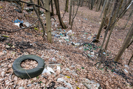 Illegal garbage dumping near the forest in the countryside