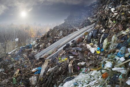 Pollution concept. Garbage pile in trash dump or landfill. Garbage dump, various trash and waste material, environmental pollution and ecology concept, selective focus