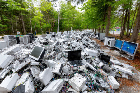 A large heap of electronic waste cluttered in a wooded area highlights growing e-waste problems during daylight.