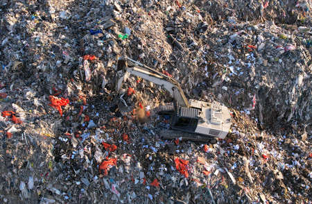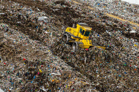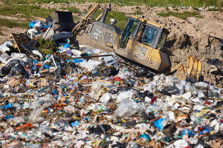 Landfill waste disposal. Garbage dump with waste plastic and polyethylene. Bulldozer at landfill working on rubbish disposal. Reduce greenhouse gas emissions and methane emissions.