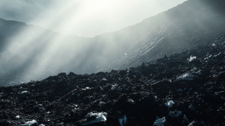 Piles of plastic debris dominate a landfill site, illuminated by soft light filtering through the clouds, prompting reflections on waste management.