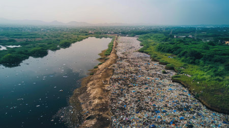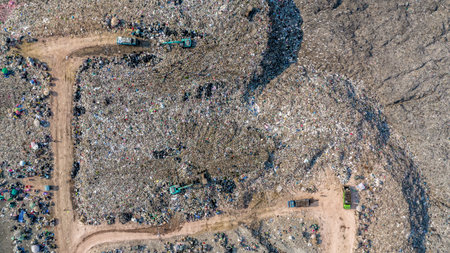 Aerial view reveals vast waste areas, highlighting the need for recycling and cleanup.