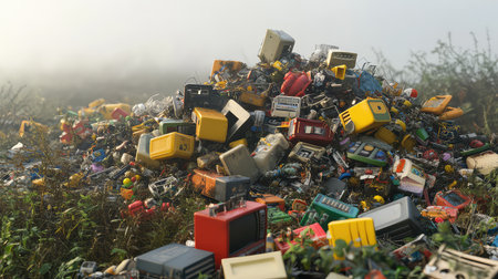 A vast pile of electronic waste stands tall amidst a foggy background, illustrating the growing concern of e-waste pollution and environmental damage.