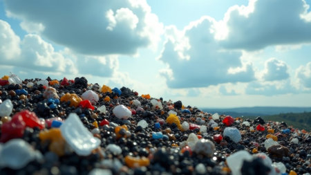 A towering mound of waste plastic dominates the landscape at a landfill under a bright blue sky, highlighting the environmental crisis.