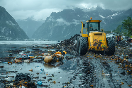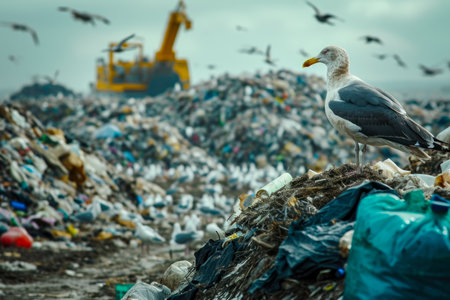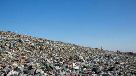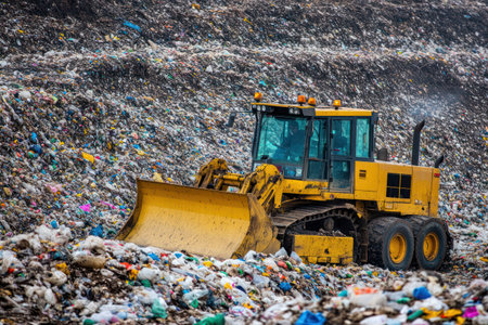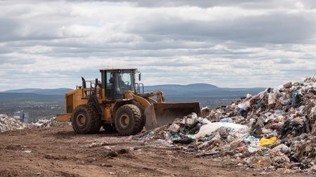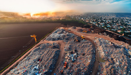 Heavy machinery works diligently to manage waste at a bustling landfill surrounded by endless refuse.