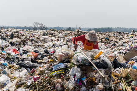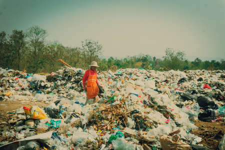 Nong Bua Lam Phu province, THAILAND. February 5 2019. Waste from household in waste landfill and men worker.