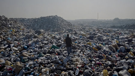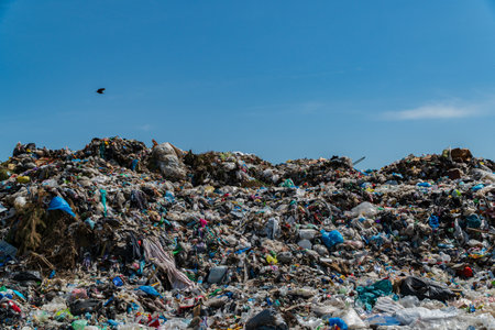 Mountains of plastic and debris dominate the landfill landscape, highlighting the ongoing challenges of waste management and pollution.