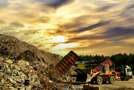 Dump truck unloading garbage from a landfill. Garbage disposal.