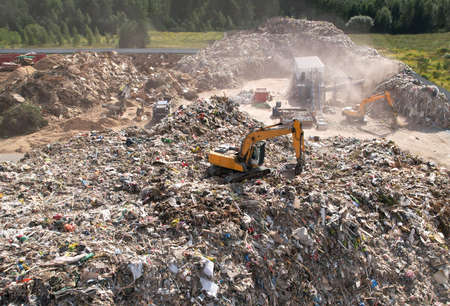 Garbage dump with construction waste. Excavator during recycling of waste at junk yard. Trash disposal and food waste. Dispose the rubbish in landfill. Trash disposal and rubbish dump with pollution.