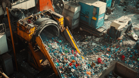 An overview of an industrial recycling facility showing waste management operations. This image depicts machinery processing plastic waste, highlighting environmental concerns.