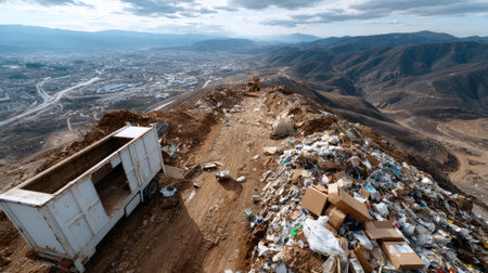 Landfill waste disposal. Garbage dump with waste plastic and polyethylene. Garbage truck unloads rubbish in landfill. Reduce greenhouse gas emissions and methane emissions. Environmental protection.