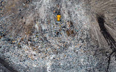 Garbage dump with food waste. Arial view of garbage truck unloads rubbish in landfill. Plastic rubbish dump. Reduce greenhouse gas emissions and methane emissions. Environmental protection