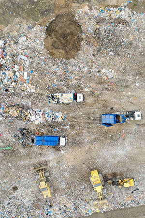 Aerial view garbage pile in trash dump landfill, Garbage pile in trash dump or landfill, Environmental pollution global warming, Garbage truck unloads rubbish in landfill waste disposal dump.