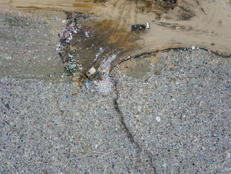 Truck brought household waste landfill, no recycling and separation, aerial top view landfill background environmental plastic pollution
