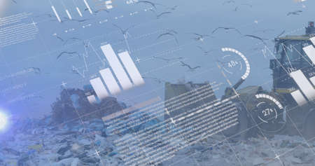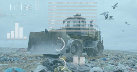 Image of multiple graphs with database moving over bulldozer unloading junk at landfill. Digital composite, multiple exposure, infographic, recycling, pollution, waste management, conservation.