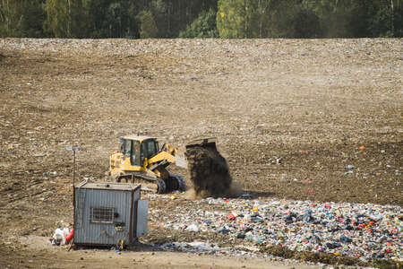 A Bulldozer machine moving waste and household garbage on a large landfill heap