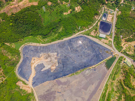 Aerial view garbage pile in trash dump landfill, Garbage pile in trash dump or landfill, Environmental pollution global warming, Garbage truck unloads rubbish in landfill waste disposal dump.