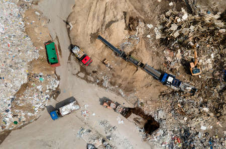 Garbage dump with food waste. Arial view of garbage truck unloads rubbish in landfill. Plastic rubbish dump. Reduce greenhouse gas emissions and methane emissions. Environmental protection