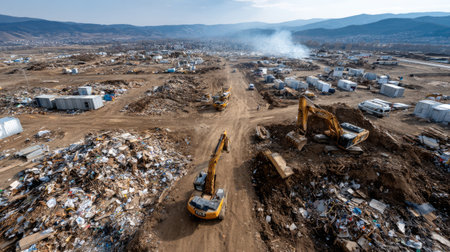Heavy machinery works diligently to manage waste at a bustling landfill surrounded by endless refuse.