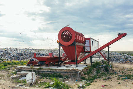 Garbage dump with construction waste. Excavator during recycling of waste at junk yard. Trash disposal and food waste. Dispose the rubbish in landfill. Trash disposal and rubbish dump with pollution.