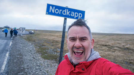 Nordkapp, Norway - June 2016: Tourist taking a happy selfie under the Nordkapp sign, the northernmost point of Europe