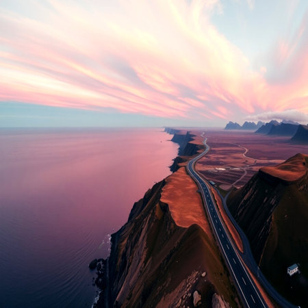 Generative AI : Aerial view from Reynisdrangar viewpoint with views over the road to Dyrholaey Arnardrangur Reynisfjara Dyrholavegur Iceland
