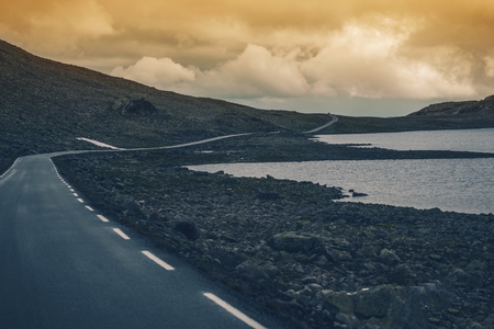 Road to scandinavian mountains at breathtaking national park on gloomy autumn day.