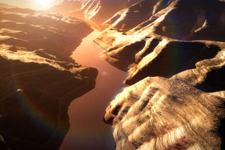Aerial shot of a Canyon with a Natural Fault Drainage Basin Lake 3D Artwork Illustration
