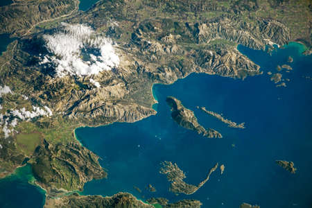 Western Coastline of Greece, high resolution aerial photo of the Aegean Sea, blue sea and mountainous coastline taken from space.