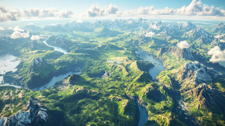 A 3D rendering of Earth showcasing various landforms such as mountains, valleys, rivers, and plains,