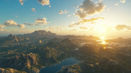 Stunning aerial view capturing a majestic mountain landscape at sunset, featuring a serene lake and vibrant sky full of clouds, ideal for nature lovers and adventure enthusiasts.