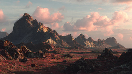 Mountain landscape at sunset. 3d render. Computer digital image.