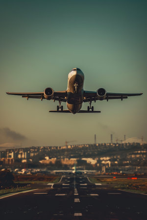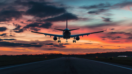 Airplane taking off at dusk, transporting passengers in the aerospace industry generated by artificial intelligence