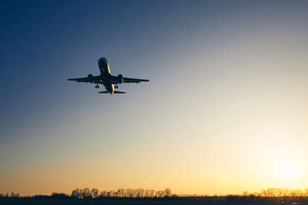 Landscape with white passenger airplane flying in the blue sky at colorful sunset.