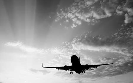 Silhouette of the airplane landing against moody sky at golden sunset.