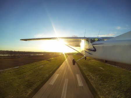 Aerial view of a small Airplane Taking off on a runway from an airport.