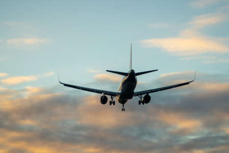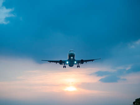 The silhouette of a passenger plane coming in for landing against the backdrop of the sunset sky.