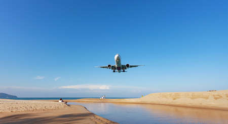 Woman have fun on the beach watching the landing planes. Traveling on an airplane concept. Text space. Island Phuket in Thailand. Impressive paradise. Hot beach Mai Khao. Amazing landscape BANNER, LONG FORMAT