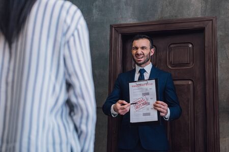 Angry collector pointing with pen at documents with foreclosure and final notice lettering in front of woman in room